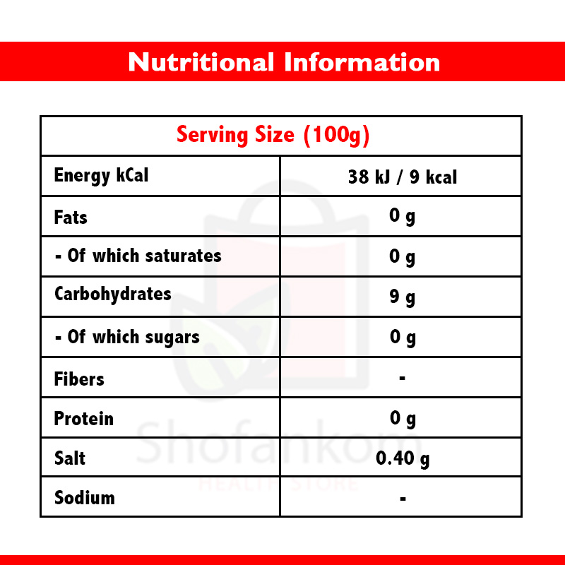 ماء، محليات (اريثريتول، مالتيتول، سكرالوز)، ألياف الخيزران، مثبت (صمغ الزانثان)، ملح، مسحوق الفراولة المجففة (0.1%)، نكهات، مواد حافظة (بنزوات الصوديوم)، حمض (حمض الستريك)، مستخلص الجزر، لون (قرمزي).