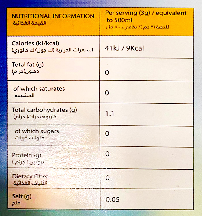 حامض (حمض الستريك)، مالتوديكسترين، مستخلص الشاي الاسود (13.8٪)، مسحوق لون كراميل، مالتوديكسترين، محليات (سوكرالوز، أسيسولفام البوتاسيوم)، مسحوق عصير الليمون(مالتوديكسترين وجوامد الفاكهة) (5.20٪)، نكهة، عامل مضاد للتكتل (ثاني أكسيد السيليكون، فوسفات ثلاثي الكالسيوم).