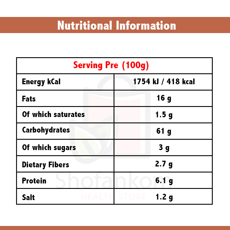 أرز برونزي كامل الحبوب 80%، زيت نباتي (زيت عباد الشمس، مضاد للأكسدة: مستخلص إكليل الجبل)، بهارات “أملاح باشيلسليا” 6%، (سكر، مالتودكسترين، ملح، مسحوق فلفل 5%، مسحوق بصل، مثبت: كلوريد البوتاسيوم، صمغ عربي؛ منظمات الحموضة: حمض الستريك، ثنائي أسيتات الصوديوم؛ زيت جوز الهند، عامل مضاد للتكتل: ثاني أكسيد السيليكون؛ نشا الذرة، مسحوق فلفل جالابي 0.3%، بقدونس مجفف 0.2%، مسحوق طماطم 0.1%، عطور طبيعية).