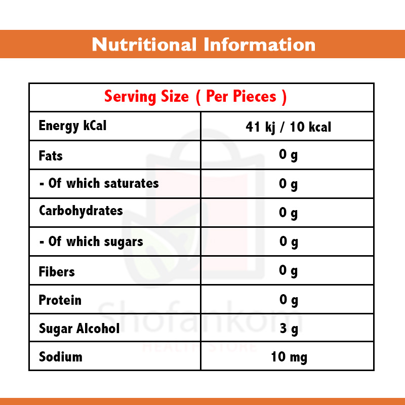 إكسيليتول، سوربيتول، قاعدة العلكة، شراب المالتيتول، مانيتول، نكهات طبيعية وصناعية، أقل من 2% من: أسكوربات الصوديوم (فيتامين ج)، مالتوديكسترين، نشا الأرز، حمض الماليك، الجلسرين، حامض الستريك، مسحوق الفاكهة (البرتقال). مركز العصير، مالتوديكسترين)، الأسبارتام، الليسيثين (الصويا)، السكرالوز، استرات الأحماض الدهنية السكروز، أسيسولفام K، هيدروكلوريد البيريدوكسين (فيتامين ب 6)، كربوكسي ميثيل السليلوز الصوديوم، نشا الذرة، BHT للحفاظ على النضارة، الكرنوبا شمع ملون بـ: (خلاصة البابريكا، عصير الفواكه، عصير الخضار)، فيتامين ب12. الفينيل كيتونوريا: يحتوي على الفينيل ألانين.