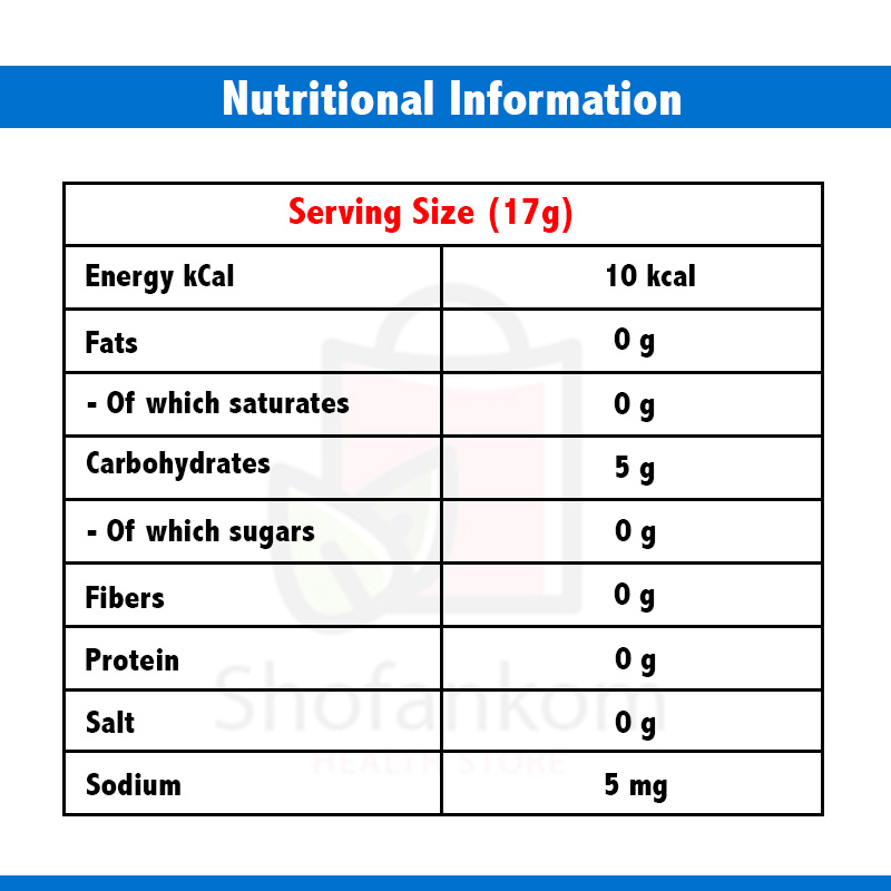 المكونات: ماء، بولي دكستروز، مالتوديكسترين، توت أزرق. يحتوي على ٢٪ أو أقل من: بكتين الفاكهة، حمض الستريك، صمغ حبوب الخروب، سوربات البوتاسيوم (مادة حافظة)، نكهات طبيعية، كلوريد الكالسيوم، سكرالوز (محلي غير مغذي)، أحمر ٤٠، أزرق ١.