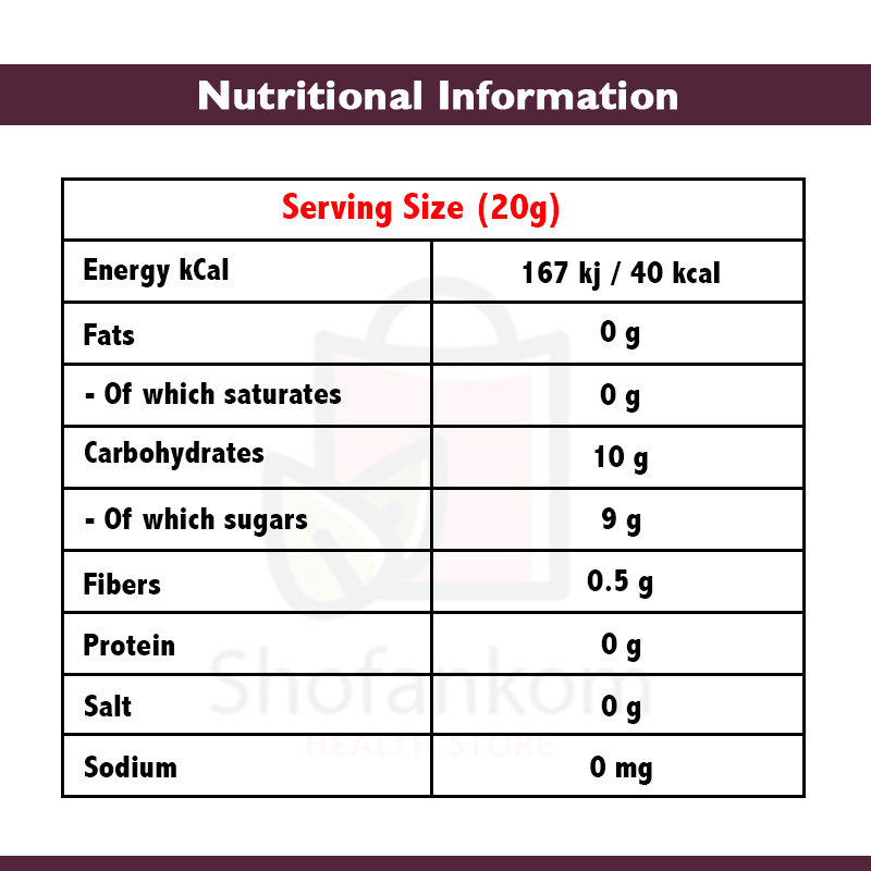 الكرز الأسود 51% (الأصل: الاتحاد الأوروبي وخارج الاتحاد الأوروبي)، مركزات عصير الفاكهة غير المحلاة (العنب، التمر)، عصير الليمون، عامل التبلور: البكتين الفاكهة.