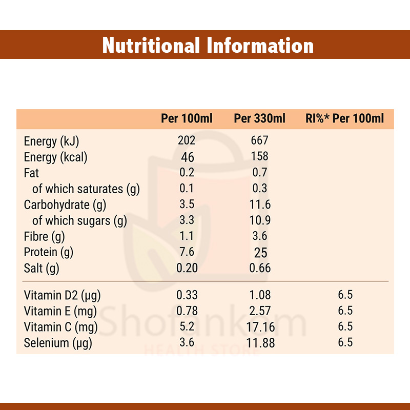 حليب خالي الدسم، ماء، بروتين الحليب، إينولين، مسحوق كاكاو قليل الدسم (0.2%)، ألياف الشوفان (غلوتين)، مثبتات: صمغ جيلان، كاراجينان، منكهات، منظم حموضة: سترات الصوديوم، ملح، مُحلي: سكرالوز، مزيج من الفيتامينات والمعادن (فيتامين ج، فيتامين هـ، سيلينيوم، فيتامين د2).