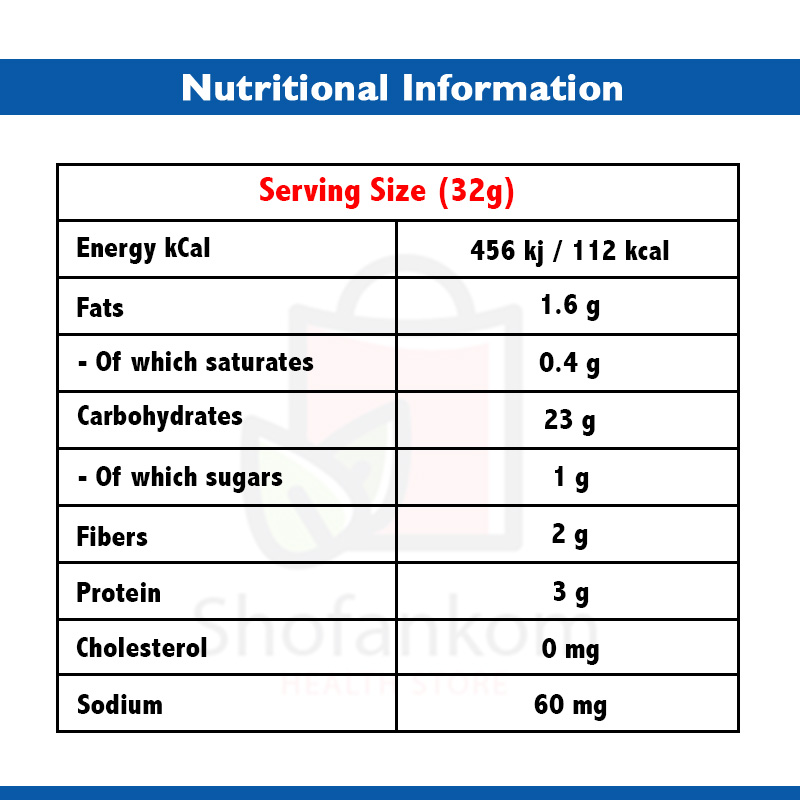 دقيق الشوفان – دقيق الذرة – دقيق الأرز – لبن بودرة كامل الدسم – كاكاو – نشا – خلاصة نبات الاستيفيا – ملح – فانيليا